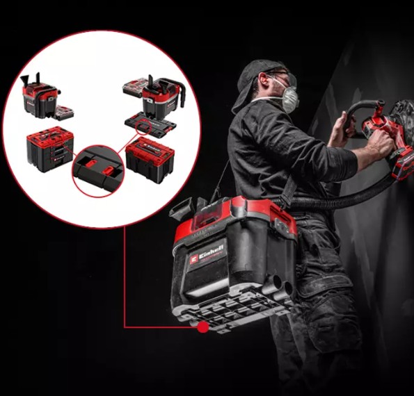 La aspiradora inalámbrica para sólidos y líquidos Einhell Professional TP-VC 18/10 Li BL L-Solo incorpora el sistema modular E-Case de Einhell. Es compatible con una E-Case de tamaño medio, una E-Case con bloqueo de tamaño medio o la placa adaptadora E-Case.