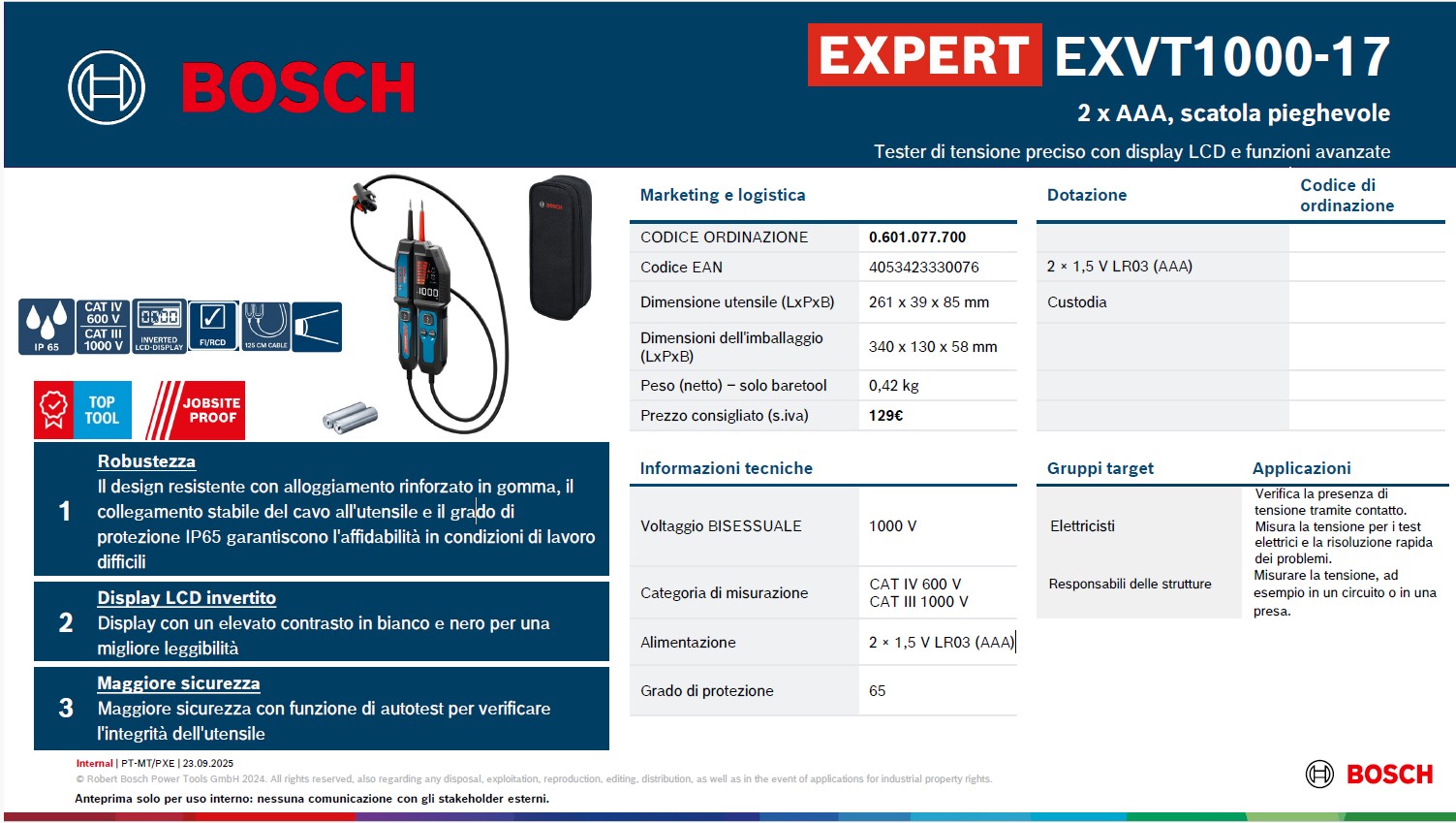 En resumen, el Bosch Expert EXVT1000-17 es un comprobador eléctrico profesional, práctico y seguro, ideal para quienes buscan una herramienta confiable para realizar comprobaciones rápidas y diarias en sistemas eléctricos.